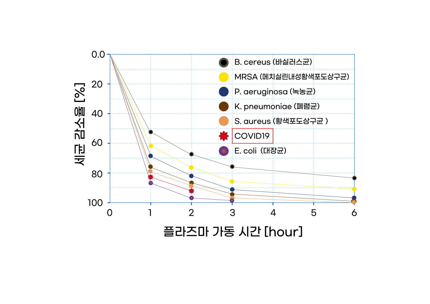 The pathogen experiment graph shows the reduction of pathogens over time in an enclosed space with the Plasma Virus Cleaner running. Roughly 87% of the pathogens tested, including COVID-19, sees over a 60% reduction ofits original concentration in the enclosure. Only two hours of runtime is required to reduce over 90% of COVID-19.
