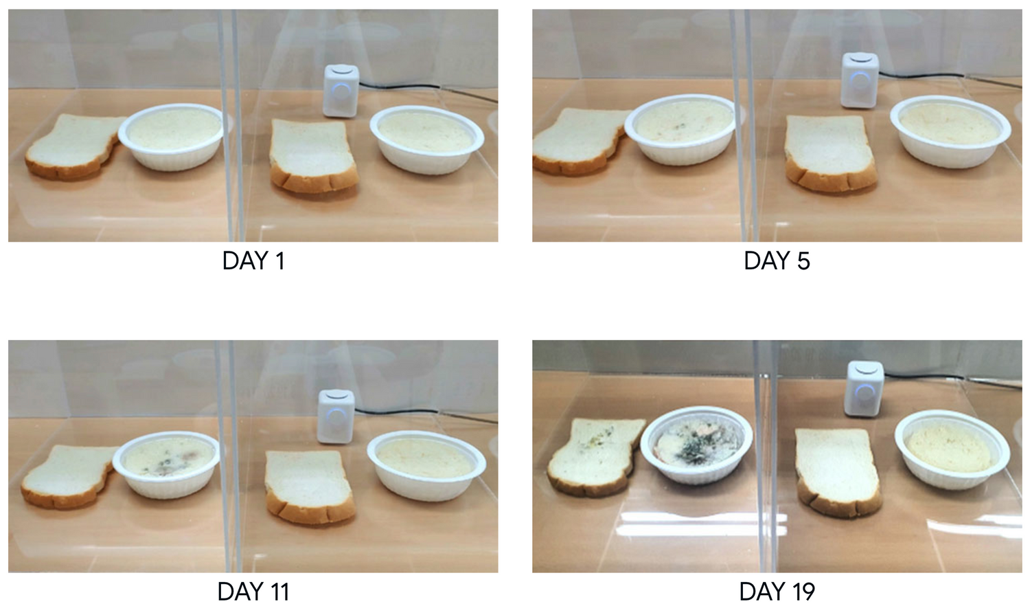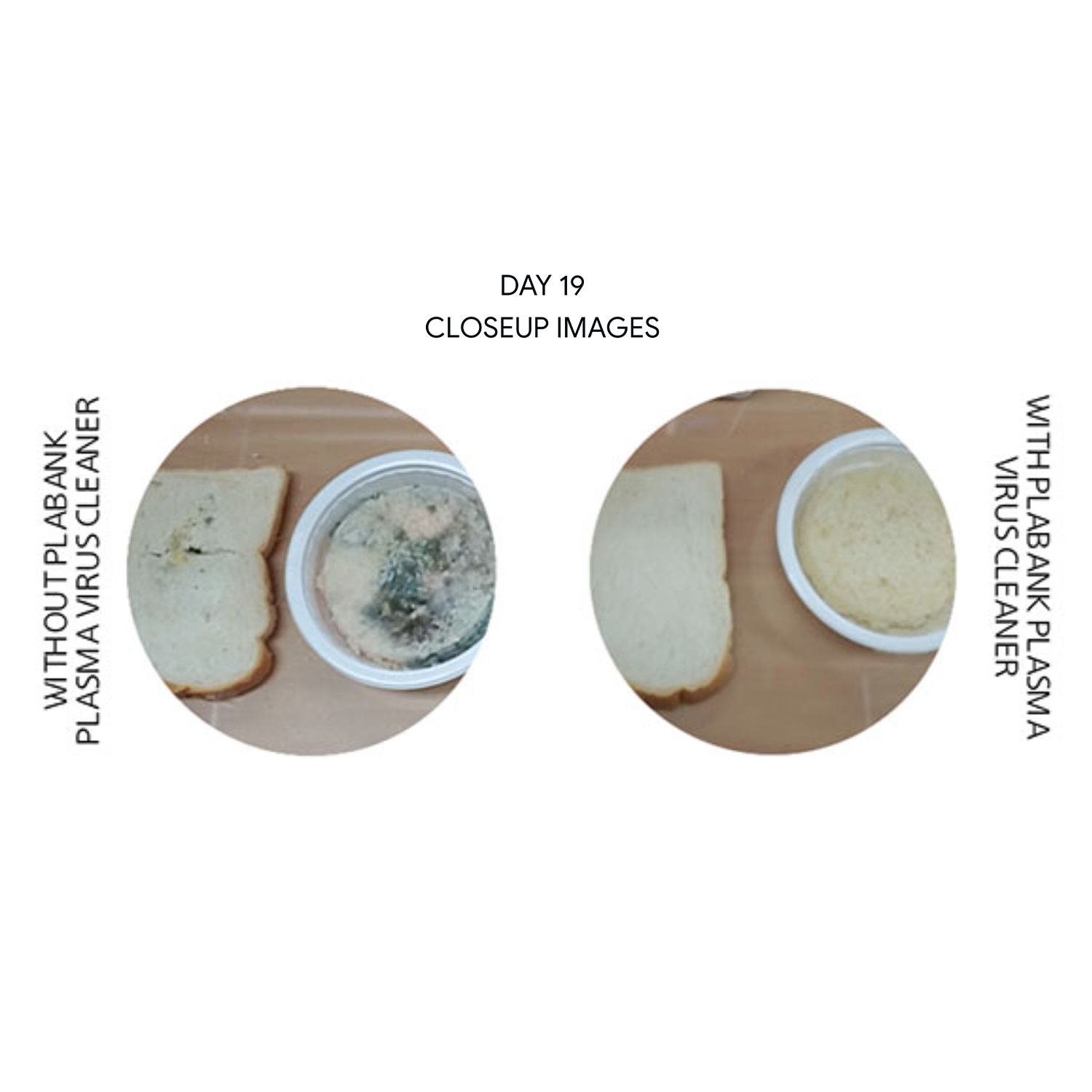 The images of the Food Spoilage Experiment show the effects of running plasma with food compared to the control without any plasma over a 19-day period. This visualizes that the fungi and bacteria that naturally grow on food in constant temperature and pressure, does not grow or is starkly reduced with the Plasma Virus Cleaner running even over two weeks of time.